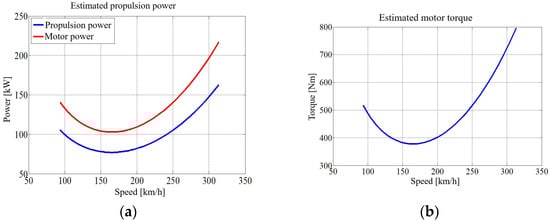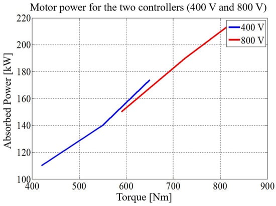 It is observed that from the perspective of absorbed power (Table 3 and Figure 10), the difference between the two variants is not significant in the torque domain they overlap, but the variant with two engines mounted on the same shaft, powered at 400 V, better covers the required torque domain. So, it seems that this is the more advantageous option, although it involves doubling the weight of the motor and controller.