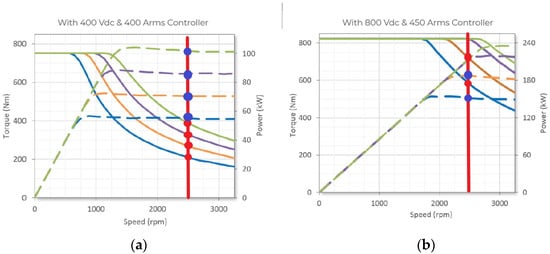 In the documentation of the YASA 750 R motor [14], the characteristics of this motor are presented for operation with a 400 V/400 A controller and for an 800 V/450 A controller. These characteristics are shown in Figure 9a,b. The continuous curves are the dependences torque–speed at the constant power. The dashed curves are power–speed curves at a constant torque. In this manner, the motor catalog is presented. To keep the same propeller, it is necessary for the motor to operate at approximately 2500 rpm and provide the required shaft torque for the propeller, as shown in Figure 9b. It can be observed that with the 400 V/400 A controller, a single motor cannot achieve the required shaft torque at 2500 rpm, but this type of motor easily allows the installation of multiple motors on the same shaft (for example, the Rolls Royce Evolito aircraft has three such motors mounted on the propeller shaft). In the version with the 800 V/450 A controller, the shaft torques can reach the necessary values. The choice of the convenient option arises. Two motors mean doubling the weight for (motor + controller), and the option with the 800 V/450 A controller means an inverter for the 800 V voltage or 800 V batteries. Usually, batteries with higher voltages are heavier. So, from the motor’s point of view, it can be said that implementing the electric propulsion system for the ZLIN 142 aircraft is possible. We present below an estimate of the two options regarding the power absorbed from the batteries.