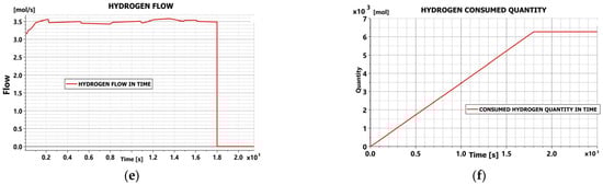 The hydrogen flow rate consumed by the fuel cell is presented in Figure 12e, with the total quantity of hydrogen shown in Figure 12f. The total amount of hydrogen consumed during the 1800 s of fuel cell operation is 6200 mol, equivalent to 12.4 kg of H2.