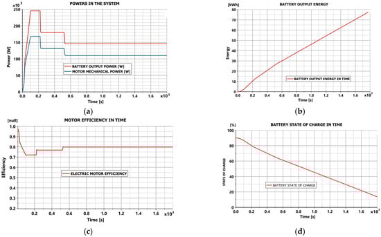 Simulation results for option 2. (a). powers in the system; (b). battery output energy; (c). electric motor efficiency; (d). battery state of charge.