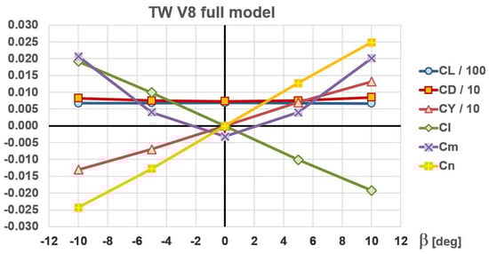 Initial verifications of the full model calculation algorithm were carried out as follows: (a) by comparing the results for TW V8 lift, drag, and pitching moment coefficients obtained within longitudinal analysis with those obtained by the half model [1] (Table 1) and, (b) by comparing calculated values of six aerodynamic coefficients obtained by the full model at sideslip angles = ± 5° and = ± 10° (Table 2 and Figure 3).