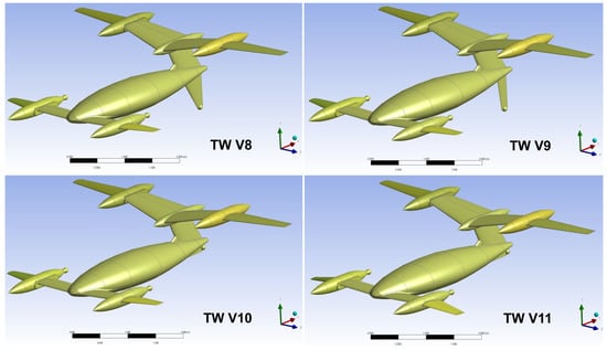 Starting TW V8 configuration for lateral-directional optimizations, and the first three optimization models without winglets. TW V9—lower vertical tail area was halved, with span preserved; TW V10—lower vertical tail was removed; TW V11—anhedral angle was applied on outer segments of the front wing.