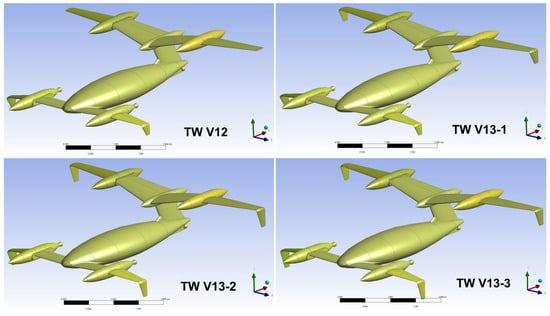 Consecutive four lateral-directional optimization models with inverted winglets. TW V12—inverted winglets were added to the front wing only, to investigate their basic influence; TW V13-1, V13-2, and V13-3—winglets were added to the rear wing as well; front and rear winglet spans (vertical lengths) were varied.