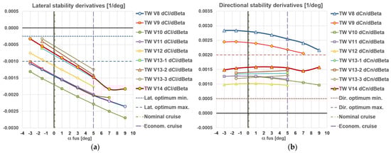 The ratio is optimal for TW V14 at the nominal FC/LL regime, while at the economical EC, it is (Figure 11b). In order to discuss the second value, a small digression will be made. Reference [20] states that the optimum lateral-directional stability ratio of −0.5 can increase to about −1.0 in the transonic speed domain, which is considered tolerable (due to the influence of compressibility effects, lift curve slope increases as M = 1 is approached; remark by authors of this paper). Although here, the analyzed TW UAV is not aimed to fly even near the transonic regime, this statement by Raymer [20] can indirectly be transferred to formally establish another rule of thumb, that can be adopted as an acceptable range for this ratio in operational use; too large static stabilities are not desirable as well. The mentioned value at the EC regime fits within this range.