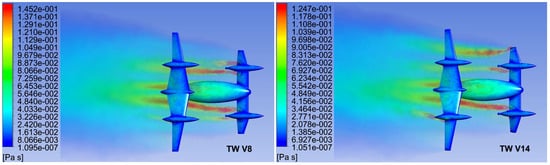 To provide a qualitative insight into this phenomenon, flow field visualizations based on the eddy viscosity distributions have been made, and they are presented in Figure 12, Figure 13 and Figure 14. At = 5°, the asymmetric flow due to the β = 5° shows no visible difference between the V8 and V14 flow field patterns. At = 7° on V8, a separation vortex on the inner side of the front-left engine nacelle is noticeable, together with a small vortex on the outer edge of the front-right nacelle. On the V14, the front-left nacelle vortex is a bit stronger, while the front-right nacelle vortex is hardly visible. A crucial difference can be observed in Figure 14, where at = 9° on V8, four separation vortices appear on both sides of the front engine nacelles. At the same angle of attack, on the V14′s outer right nacelle, the vortex has almost vanished, while the left outer vortex has moved from the left nacelle to the front left winglet. This has degraded its efficiency, causing a slight increase in directional stability (its destabilizing contribution is downgraded), and stagnation in the dihedral effect, in spite of the increase from 7° to 9° (see Figure 11).