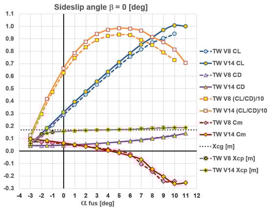 The next very important step was the assessment of applied lateral-directional optimization on the possible degradation of the V8’s well-established longitudinal characteristics. For that purpose, their longitudinal aerodynamic characteristics were summarized in Table 3 and Table 4. The lift , drag , and pitching moment coefficients, as well as lift-to-drag ratios, were presented as functions of the fuselage angle of attack. The following column shows variations of the center of pressure distance from the fuselage nose with , next to the estimated position of the center of gravity , which is the same for all aerodynamic analyses of this UAV. In the next three columns, separate contributions of the front and rear wing, as well as other structural components (fuselage and four engine nacelles) to the global lift are presented.