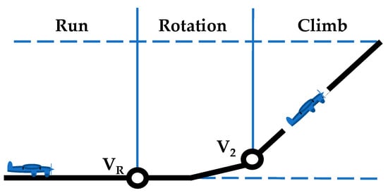 The takeoff profile of a fixed-wing UAV is usually divided into three phases: run phase, rotation phase, and climb phase, as shown in Figure 1 [15]. In this paper, only a climb phase is dealt with in order to clarify the effectiveness of our method. First, the equations of equilibrium acting on the airplane during a steady climb are described in Section 2, followed by an explanation of how to derive the maximum rate of climb using optimization problems. The equation relating the thrust generated by the propeller engine to airspeed, the specifications of the airplane under consideration, and the calculation results of the maximum rate of climb are also described. Section 3 describes the results of a 6-DOF flight simulation conducted to confirm whether the maximum rate of climb obtained from the analysis of a mass system can be realized in an actual 6-DOF environment. The section also describes the control system to achieve steady climb at the maximum rate of climb used in the 6-DOF flight simulation. Section 4 describes the criteria and experimental results of the steady climb in the flight experiments using the model airplane to confirm the validity of the maximum rate of climb, and finally Section 5 concludes the study.