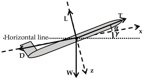 Lift and drag are defined as functions of the angle of attack α and airspeed V, and are expressed as Equations (3)–(5) [16].