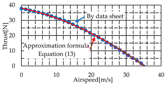 For the above reasons, it is difficult to theoretically, experimentally, and numerically determine the thrust of a propeller engine. Therefore, this study uses airspeed vs. thrust data under constant propeller speed published by propeller manufacturers [20]. The thrust was derived for an engine with a propeller size of 14 inches by 8 pitch angles and a maximum propeller speed of 8000 rpm in the blue dot line shown in Figure 3. The relationship of airspeed with thrust was obtained as Equation (13) after a second-order approximation.