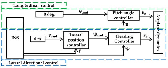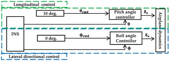 After the airplane’s airspeed reaches the rotation speed (VR), the airplane transits from the run phase to the rotation phase. The block diagram of the rotation control system is shown in Figure 6. In the lateral-directional control system, the ailerons are controlled to keep the airplane horizontal. In the longitudinal control system, the nose is raised to a designated angle to increase the lift until the airplane leaves the ground. The pitch angle during this phase is set to be 10 degrees with 2 degrees of margin to prevent the tail of the airplane from hitting the ground during the run.