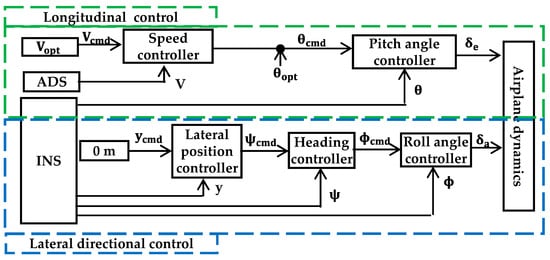 After reaching a safe takeoff speed (V2), the airplane transits from the rotation phase to the climb phase. The block diagram of the climb control system is shown in Figure 7. During the climb phase, in the lateral-directional control system, the airplane climbs straight onto the runway, i.e., the lateral position of the airplane is maintained to be on the centerline of the runway by controlling the ailerons. The longitudinal control system aims at achieving a steady climb at the maximum rate of climb. During this steady climb, the airplane’s motion is balanced; if one of the airspeed, path angle, and angle of attack is determined, the remaining two values are uniquely determined. Therefore, the pitch angle is controlled with maximum thrust so that the airspeed matches the one (15.1 m/s) at which the maximum rate of climb can be achieved. When the airplane’s airspeed is greater than that of the optimal solution, the pitch angle is increased so as to convert kinetic energy to potential energy. On the other hand, if the airplane’s airspeed is below the optimal solution, the pitch angle is reduced so as to convert potential energy to kinetic energy. Here, the pitch angle of the optimal solution is added to the pitch angle command at the start of the climb phase. Furthermore, each control system uses PID controllers. The throttle is fixed at position where it generates maximum thrust during takeoff. However, the actual magnitude of the thrust in this case follows Equation (13). The airspeed used in the above flight control is measured by the ADS, and the attitude angle and position by the INS.