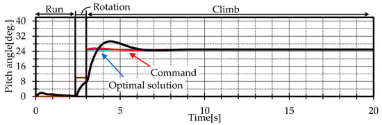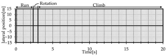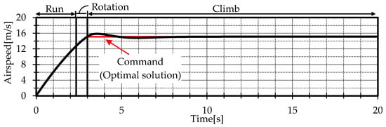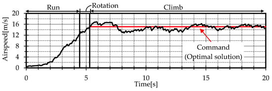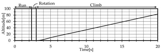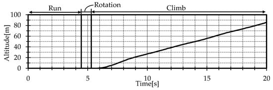 The speed at which the airplane transits from the run phase to the rotation phase (rotation speed VR) was set to be equal to the stall speed (Vs1) in the takeoff configuration obtained from Equation (14), as in reference [22]. The switching speed from the rotation phase to the climb phase (safety takeoff speed V2) was set to be 1.2 times the stall speed from reference [24], and these values are shown in Table 5. In addition, the simulation time was set to be 20 s by using the result of the takeoff of flight experiment in reference [4] in which the UAV used flew at a lower speed.