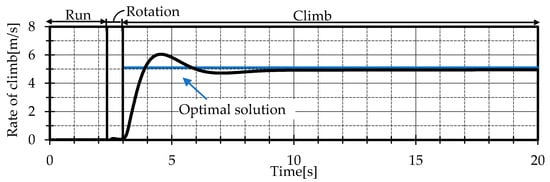 The simulation results for the entire takeoff, from run to rotation and climb, are shown in Figure 8, Figure 9, Figure 10, Figure 11 and Figure 12. The airplane took off straight along the centerline of the runway without moving laterally, as shown in Figure 8. As shown in Figure 9, the airplane climbed to an altitude of about 80 m at the end of the simulation. Figure 10 and Figure 11 show that the profile of the airspeed and the pitch angle exceeded the command values just after the start of climb, but in 3 s, the airspeed converged to 15.1 m/s and the pitch angle to 24.9 degrees, respectively. That is to say, the airplane reached a steady state of climb in about 7 s after the start of climb. The rate of climb is confirmed to be 4.9 m/s, as shown in Figure 12. The difference between the rate by simulation and the one by the optimal method is just 0.2 m/s, which is approximately 3.9% of the maximum rate of climb and negligibly small. Therefore, it was confirmed that the takeoff, including the climb at a maximum rate of climb, could be well achieved.