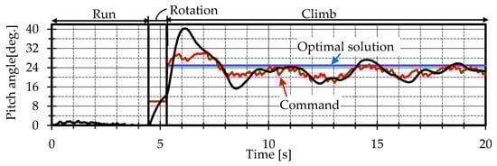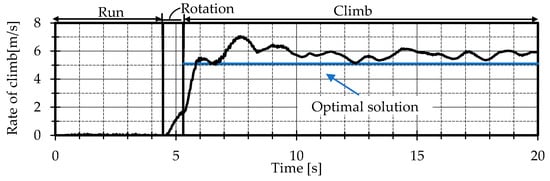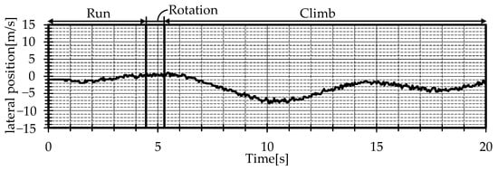 The results of the flight experiment are shown in Figure 13, Figure 14, Figure 15, Figure 16, Figure 17 and Figure 18. The lateral position in Figure 14 was calculated from the latitude and longitude of the airplane measured using the INS. The altitude, pitch angle, and rate of climb of the airplane in Figure 15, Figure 17 and Figure 18 were measured using the INS. The airspeed of the airplane in Figure 16 was measured using ADS. The airplane took off for approximately 24 s from the start of the experiment and finally reached an altitude of 110 m, as shown in Figure 13. The following data are presented for the first 20 s after the start of the experiment to correspond with the simulation results of the previous section. Figure 14 shows that the airplane deviated laterally from the runway by a maximum of 8 m during takeoff, but approximately took off in a straight line along the runway centerline. Thus, during the flight experiment, the airplane only moved vertically. The airplane climbed to an altitude of about 80 m in 20 s after takeoff, as shown in Figure 15. The airspeed and pitch angle met the criteria for steady climb in 15 s after the start of the run, and the mean values of airspeed and pitch angle thereafter were 15.1 m/s and 22.0 degrees, respectively, although the pitch angle exceeded the command values by about 10 degrees just after the start of climb, as shown in Figure 16 and Figure 17. The convergence value of the rate of climb was 5.7 m/s, as shown in Figure 18. The discrepancy between the optimal solution of 24.9 degrees and the experimental pitch angle of 22.0 degrees was caused by noise from sensors such as the ADS and uncertainties in the aerodynamic coefficient. Considering these factors, the pitch angle deviation of 2.9 degrees from the optimal angle in the flight experiment is acceptable, and the maximum rate of climb is achieved.