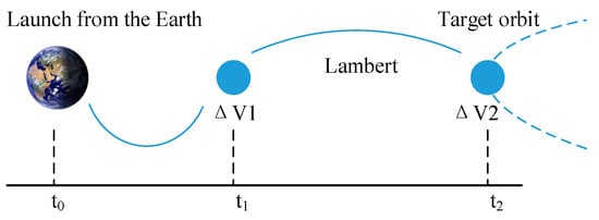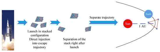 The current main domestic and foreign space-based gravitational wave observatories include the Laser Interferometer Space Antenna (LISA) launched jointly by NASA and the ESA, the Taiji program proposed by the Chinese Academy of Sciences, and the TianQin project initiated by Sun Yat-Sen University. Each of the three missions consists of three satellites, which constitute an ultra-large-scale formation. Each satellite carries two test masses, between which laser beams transfer information. When gravitational waves pass through the laser beams, the laser interferometer records the changes in the optical path. In the LISA [3,4,5,6] and Taiji [7,8,9,10] missions, the three satellites sit in a heliocentric orbit, leading or trailing the Earth by around 20°, forming an equilateral triangle with side lengths of 2.5~3.0 × 106 km. In the TianQin mission, the three satellites are located in a geocentric orbit 105 km away from Earth, forming an equilateral triangle with side lengths of 1.7 × 105 km [11,12,13,14,15]. Each satellite is approximately 1.5 tons in weight. Both heliocentric and geocentric formations adopt the method of launching three satellites with one rocket, which has high requirements in terms of the carrying capacity of the rocket. Therefore, a proper transfer design is a prerequisite for achieving space-based gravitational wave detection.