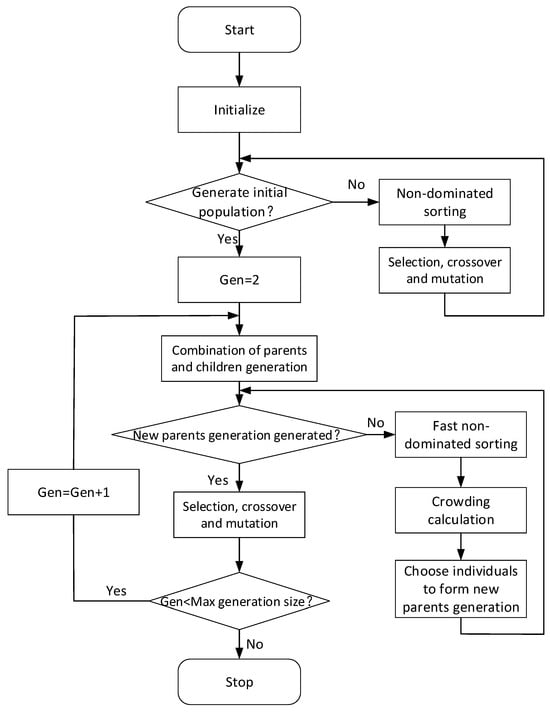 Later, Deb improved the NSGA algorithm and proposed the NSGA-II algorithm with an elite strategy, which made up for the defects of NSGA. The NSGA-II algorithm is simpler than the NSGA algorithm, and preserves the diversity of the population by uniformly distributing the Pareto front. Moreover, the NSGA-II algorithm expands the sampling space, and combines the parent and offspring populations for tournament selection to produce the next population, and to find the optimal solution that may be missed in the parent population.