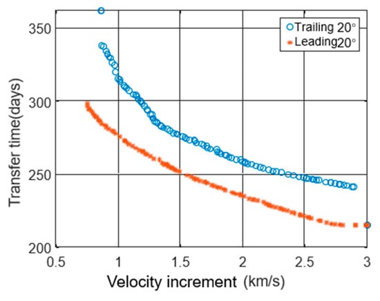 The satellites leave the Earth’s parking orbit on 1 April 2026. The Pareto curve of the optimal solutions is shown in Figure 4. In practice, due to the limited capacity of the satellites to carry fuel, the velocity increment should not be too large, so we only consider the situation of a velocity increment less than 1 km/s. When the formation trails the Earth by 20°, the required velocity increment of a single satellite ranges between 0.8582 and 1 km/s, and the transfer time is 315 to 362 days. When the formation leads the Earth by 20°, the required velocity increment of a single satellite is 0.7487 to 1 km/s and the transfer process lasts 276 to 298 days. The initial phase angles of the formation corresponding to the minimal velocity increment of Earth-trailing and -leading transfers are 111° and 83°, respectively.