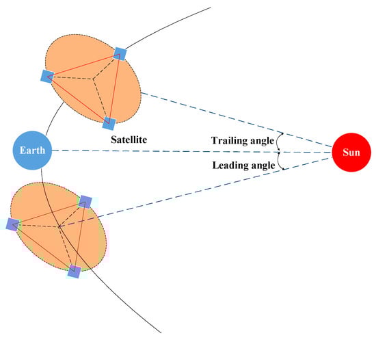 The satellites move from the Earth’s parking orbit to positions leading and trailing the Earth by 20°. The optimization variables are escape velocity increment, escape azimuth angle, escape pitch angle, coasting time, Lambert transfer time, and initial phase angle of the formation. Their respective symbols are shown in (16):