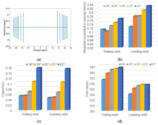 The effect of the initial trailing angle on the transfer orbit (the initial time of transfer is 1 April 2027). (a) The effect of the initial trailing angle on breathing angle; (b) the effect of the initial trailing angle on velocity increment; (c) the effect of the initial trailing angle on C3; (d) the effect of the initial trailing angle on transfer time.