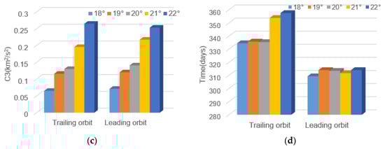 It can be seen from Figure 6 and Figure 7 that the breathing angle is significantly affected by the initial trailing/leading angle if it is smaller than 18°. However, an initial trailing/leading angle greater than 18° has a slight influence on the breathing angle. Since it is required that the change in the breathing angle should be within the range of ±1°, the formation proposed satisfies the requirement if the trailing/leading angle is smaller than 20°. According to Figure 6 and Figure 7b–d, the velocity increment required for transfer, C3, and transfer time increase with the increase in the initial trailing/leading angle, and the increase is significant when the initial trailing/leading angle exceeds 20°. Therefore, a smaller initial trailing/leading angle that satisfies the requirements of formation design is conducive to the launch. However, affected by the attraction between the Moon and Earth, the formation drifts away from the Earth more quickly during the process of completing the mission if the initial trailing/leading angle is too small.