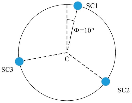 The initial phase angle of the formation affects the initial positions of the three satellites. In this section, the influence of the initial phase angle of the formation on the transfer orbit is explored. If the initial phase angle of satellite 1 is , the initial phase angles of satellites 2 and 3 are and , respectively. As gradually increases from 10 ° to 120 °, the outer circle of the formation triangle forms (Figure 8). C is the virtual center of the formation of the three satellites.
