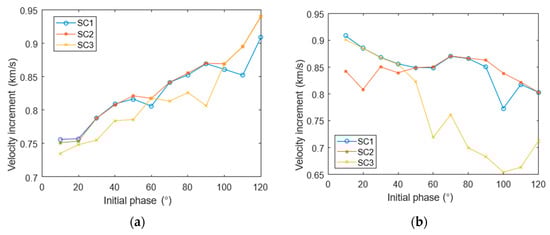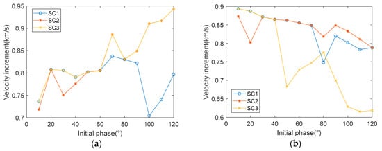 Appendix A summarizes the designing results of the transfer orbit as the initial phase angle of SC1 changes from 10° to 120° on the first day of each month in 2026. In general, the design of the transfer orbit is influenced by the initial phase angle of the formation and the initial time of transfer. For instance, it can be seen from the images in Appendix A that for the Earth-trailing formation, the transfer orbit requires a smaller velocity increment when the initial phase angle is 10° or 20° from 1 January to 1 May 2026, and when the initial phase angle is 110° or 120° from 1 June to 1 November 2026. For the Earth-leading formation, a pattern opposite to that of the Earth-trailing formation is observed. Figure 9 shows the change in the velocity increments required by the three satellites with the initial phase angle of the formation on 1 January 2026. The three satellites require the smallest velocity increment when the initial phase angle is 10° for the Earth-trailing formation and when the initial phase angle is 120° for the Earth-leading formation. Figure 10 shows the change in the velocity increment with the initial phase angle of the formation on 1 January 2027. The change pattern is similar to that on 1 January 2026.