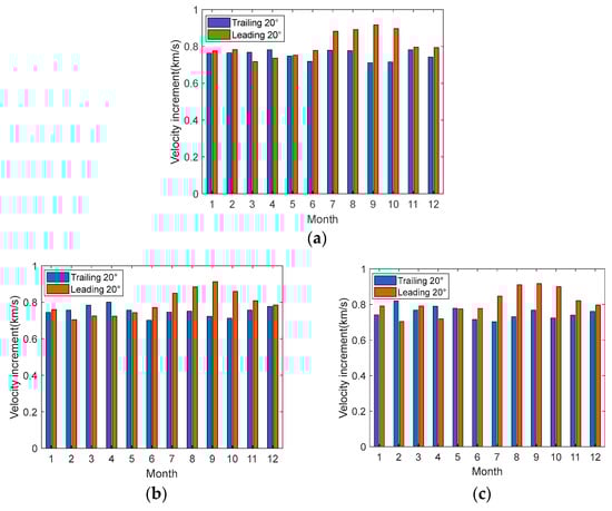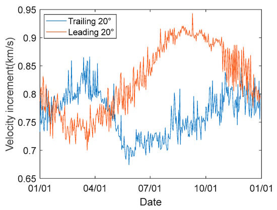 To investigate the relationship between the position of the satellites relative to Earth and the transfer orbit, the impulse transfer model is used for analysis. The change in the required velocity increment from the first day of the first month of 2026 to the first day of the last month of 2028 is shown in Figure 11. A smaller velocity increment is required from February to May in the Earth-leading formation, and from June to December in the Earth-trailing formation. To further explore the above patterns, the change in the required velocity increment every day throughout the year 2026 is analyzed (Figure 12). The required minimal velocity increments of the Earth-trailing and -leading formations are 0.6744 km/s and 0.7001 km/s, respectively.