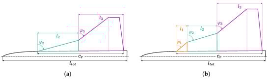 Generic multiple swept delta wing planforms with corresponding geometrical properties listed in Table 1. (a) Generic double delta wing. (b) Generic triple delta wing.