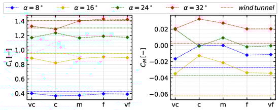 Gridstudy of an generic double delta wing. Lift coefficient and pitching moment coefficient for five grid resolution at angles of attack . Grid levels: vc—very coarse; c—coarse; m—medium; f—fine; and vf—very fine.