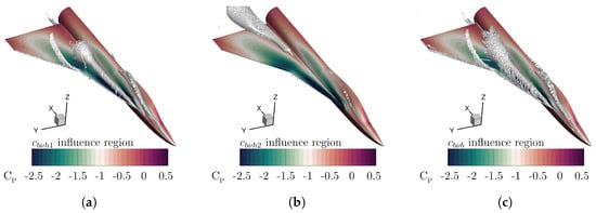 This work will focus on the terms i, v, and in Equation (1), which will be introduced in detail in the following. is the first added source term, which is only influenced by the vortex identifier and is the most similar one to the original SA source term . Secondly, the coefficient is multiplied by and the normalized helicity . The Helicity expresses the alignment of velocity and vorticity vectors. The unburst part of a vortex shows high axial and rotational velocities, where the vorticity is increased along axial direction []. Thus, the source term acts in regions of fully developed healthy vortices. To prevent the turbulence model from acting differently for right and left-rotating vortices, it is important to use the absolute value of the helicity since the quantity also considers the vortex’s chirality. In order to non-dimensionalize all added quantities, the absolute value of helicity is normalized by the free-stream velocity, resulting in a final non-dimensional helicity . The flow regions downstream of vortex breakdown are influenced by an inverted helicity-based term and the coefficient . Caused by abrupt changes in rotational and axial velocities, vortex breakdown can be enclosed by regions of high-velocity gradients. Thus, the coefficient , combined with the velocity gradient tensor and the vorticity direction, mainly influences regions near vortex breakdown. Figure 4 shows the influence of three additional turbulence model coefficients for an exemplary double delta wing configuration.