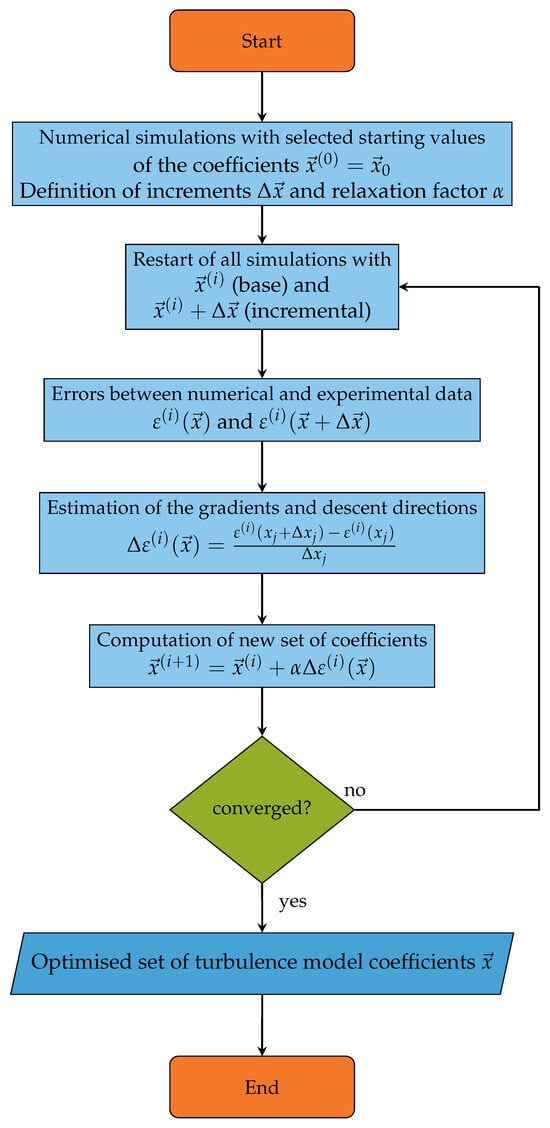 From the computed errors, the gradients and descent directions can be computed. Finally, a new updated set of turbulence model coefficients is defined by: