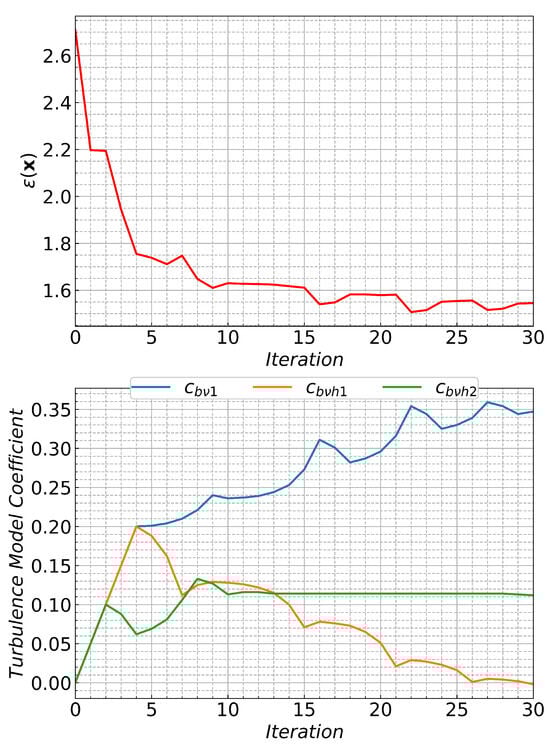 Sample optimization results. In the top part, the objective function (Equation (5)) versus optimization iterations is shown. In the lower part, the corresponding turbulence model coefficients are plotted.