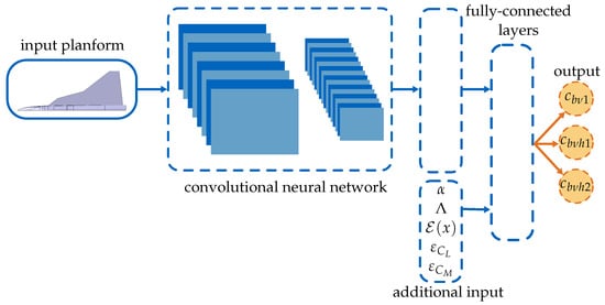 The basic idea is to design a machine learning framework to predict selected additional turbulence model coefficients. This data model outputs the proper set of coefficients based on the geometrical properties of the configuration under investigation, flow, or flight parameters. The proposed hybrid neural network (HNN) is depicted in Figure 7. The neural network consists of a CNN segment, a fully connected layer with additional inputs, and an attached feed-forward neural network part.