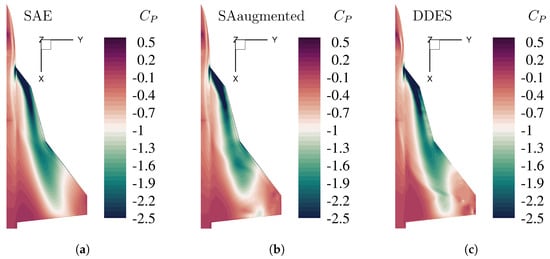 Surface pressure distribution by the means of pressure coefficient at Mach number , Reynolds number , and angle of attack , for different numerical turbulence models. (a) Original SA model with Edwards-modification. (b) Enhanced SA model with augmented model coefficients (Table 3). (c) High-fidelty DDES reference simulation.