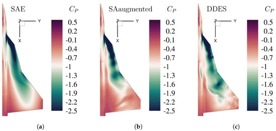 Comparing the two RANS models (Figure 8a,b), some small changes in the suction peak distribution on the main wing can be seen. The enhanced turbulence model shows lower pressure coefficient values in the front section of the main wing, similar to the high-fidelity DDES results. Looking at Figure 8 as a reference, the standard turbulence model underestimates the pressure coefficient in the rear part of the main wing, whereas the enhanced turbulence model shows a little higher pressure distribution in this area. Further, the low-pressure area on the strake section caused by the formation of the inboard vortex (IBV) shows a similar downstream distribution for the enhanced model and the DDES, whereas the suction peak for the standard model is further extended downstream from the strake section. The results for in Figure 9 show more differences for the different RANS turbulence model than for in Figure 8. While the pressure distribution for the standard model in Figure 9a is very homogenous, the results for the enhanced turbulence model in Figure 9b display some irregular patterns, with several distinct suction peaks distributed over the whole wing surface. This behavior can also be seen in the high-fidelity DDES result in Figure 9c. The pressure distribution over the strake section is similar for the enhanced model and the DDES results, where the enhanced turbulence model underestimates the pressure coefficient in the rear part of the strake section before the kink to the main wing section. The DDES result shows only a moderate suction peak in this area, whereas the enhanced turbulence model shows high negative values. Comparing the main wing section between these two models, the enhanced turbulence model better represents the pressure distribution and the suction peak. While the suction peak is located slightly upstream of the main wing compared to the DDES result, strength, resolution, and distribution are quite similar between the RANS model and the high-fidelity simulation. The different pressure distributions show that the enhanced turbulence model results in a more detailed resolution than the original SA model. While the plots of in Figure 8 show slight differences, the plots in Figure 9 for show significant differences in pressure distribution over the wing surface. The improved results for the pitching moment coefficient introduced in Section 7 (Table 4) are rooted in the enhanced resolution of the adaptive turbulence model.