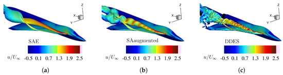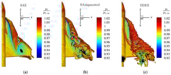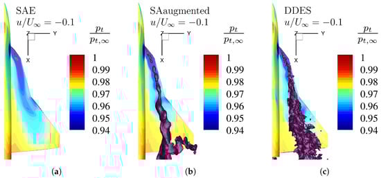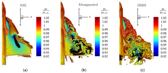 Flow field visualization by an isosurface of total pressure loss at Mach number , Reynolds number , and angle of attack , for different numerical turbulence models. The isosurface is colorized by the non-dimensional axial velocity . (a) Original SA model with Edwards-modification. (b) Enhanced SA model with augmented model coefficients (Table 3). (c) High-fidelty DDES reference simulation.