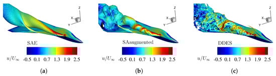 Compared to the isosurface of the high-fidelity numerical result in Figure 14c, it is obvious that the standard SA turbulence model is unable to resolve reversed flow (Figure 14a). On the other hand, the enhanced turbulence model shows similar reverse flow behavior like the DDES data. Especially the on-set position and downstream extent match the high-fidelity data nearly perfectly.