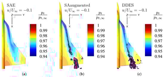 The accurate prediction of vortex breakdown and vortex breakdown positions is directly linked to the adverse pressure gradient handling of the turbulence model. Leading-edge vortices experience breakdown at high angles of attack due to the stagnation of the axial core flow caused by the adverse pressure gradient along the vortex core axis []. In the following, the comparison of reversed flow profiles for the three different numerical methods is discussed. In Figure 14, the results for the angle of attack are presented, and in Figure 15, the results for , respectively. The reversed flow characteristic is analyzed using an isosurface representing regions, where the non-dimensional axial velocity . The surface distribution for the total pressure ratio is shown.
