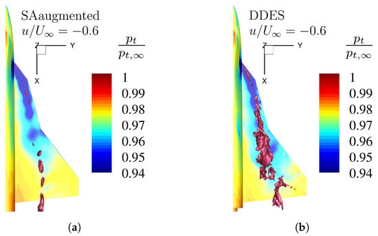 In this subsection, the vortical flow field is analyzed utilizing an isosurface of total pressure loss depicted in Figure 10 for the angle of attack and for in Figure 11. The isosurface is colored in the non-dimensional axial velocity profile , and stagnating or reversed flow is highlighted by a black isosurface representing areas of . As in Section 7.1, results for the numerical results based on the standard SA turbulence model are shown in the left-hand subfigures, and high-fidelity DDES reference results are shown in the right-hand subfigures. The results of the augmented enhanced turbulence model are depicted in the middle subfigures of Figure 10 and Figure 11.