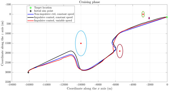 The cruising phase ends when the distance between the spacecraft and the desired position is less than a given threshold, namely, as soon as m, in the present setting.