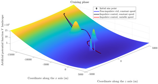 Sliding mode control is certainly not the only control strategy mentioned in the specific literature on guidance. For instance, the paper [38] combines a gradient descent-type control strategy, enriched by a damping-type term to enhance stability, with an artificial potential strategy, based on a quadratic ‘attractive’ term and a series of barrier-type hyperbolic-cotangent-shaped terms to achieve obstacle avoidance.