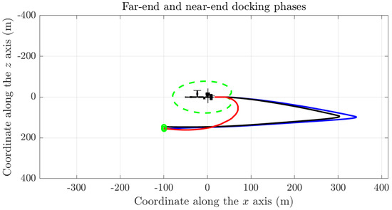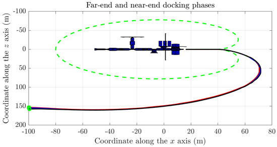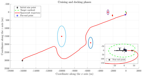 The position at which the far-end maneuver stops is indicated as (m), while the position at which the near-end maneuver stops is indicated as (m). Notice that the final target is located 15 m behind the centerpoint of the station—whose coordinate in the system is by definition—to comply with the actual position of the docking port. The values of the parameters to deploy a cardioid-shaped safety zone, as defined in Section 3.5, were set to , and m.