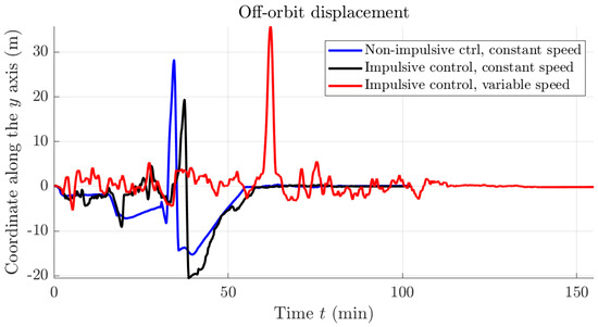 Since in the devised numerical simulations a disturbance is present even along the y axis, it is interesting to evaluate the effects of this disturbance on the ability of a spacecraft to adhere to the orbital plane. Figure 6 shows the effects of the disturbances on the y coordinate of the spacecraft in the LVLH reference frame. The control strategies were not designed with an explicit goal to keep the motion of a spacecraft over the vertical () plane, but the final guidance procedure implicitly attains this goal. From Figure 6, it is easy to notice the presence of a high peak on the coordinate of the spacecraft along the y axis corresponding to the impulsive, variable-speed control strategy, generated by the control algorithm in the proximity of the first obstacle along the spacecraft trajectory. This effect is a consequence of the repulsive force, which takes a large value due to the radius of the first obstacle, combined with random disturbances.