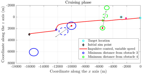 As it may be readily appreciated from Figure 7, even in the presence of moving obstacles affecting the cruising phase, the guidance algorithm performs as expected and drives the spacecraft toward the target point, while effectively avoiding the physical obstacles on its path to the space station. In the figure, two open circles mark the points on the spacecraft trajectory of minimal distance to the moving obstacles, and the dashed ovals correspond to the actual location of the obstacles corresponding to such minimal distances. Such distances are far larger than the safety radii of such obstacles, confirming that there is no contact between the spacecraft and the obstacles.