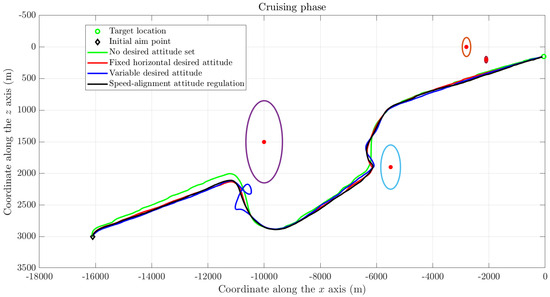 The obtained numerical results are illustrated in Figure 8, which shows the trajectory of the spacecraft along the plane in the LVLH coordinate frame. From this figure, it clearly appears that the variable desired attitude strategy fails in the proximity of the largest obstacle. On the other hand, the strategy based on not setting a desired attitude, the one based on a fixed (horizontal) attitude and the one based on velocity alignment perform similarly to one another.
