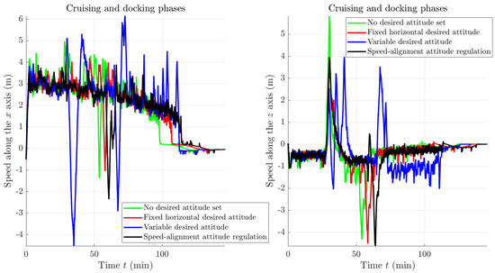 As a further element of evaluation, Figure 10 shows the velocity of the spacecraft along the x axis and along the z axis in the LVLH coordinate frame during the whole rendezvous maneuver. The velocity curves corresponding to a variable-speed, impulsive control strategy in connection with the four discussed orientation regulation methods show that the no desired attitude and variable desired attitude methods stand out negatively. Such methods, as a matter of fact, cause a sudden rise in velocity in the proximity of large obstacles.
