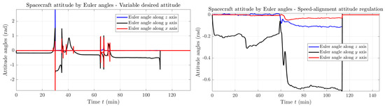 Variable desired attitude. As a second attempt, the desired attitude was set up to be the one that corresponds to the direction of the desired speed , as defined in (12). The relation between the resulting (time-varying) matrix and the components of the desired speed vector may be found in [3], in Equations (14)–(17). In such reference paper, the desired orientation with respect to the LVLH frame is obtained by calculating the orientation (Euler) angles with respect to the LVLH frame on the basis only of the three Cartesian components of the desired speed and by the orientation matrix arising from the composition of the three elementary rotations corresponding to each angle.
