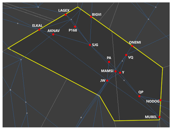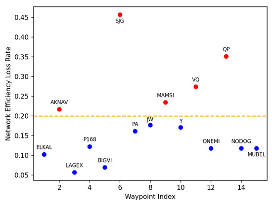 We calculate the network efficiency loss rates for each route point, as shown in Figure 8. The yellow dashed line in Figure 8 represents the boundary between the network efficiency loss rates of the first third and the last two-thirds of the nodes. It can be observed that route points SJG, QP, VQ, MAMSI, and AKNAV have relatively high network efficiency loss rates, indicating that these nodes have a significant impact on the reliability and performance of the system. They are thus considered critical nodes in the assessment of node importance. In actual operation, these route points serve as crossing points of multiple flight trajectories with a high node degree.