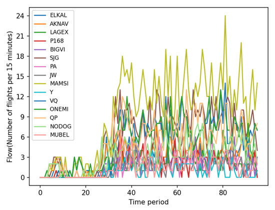 Figure 17 displays the predicted traffic results for each route point throughout the day after adding the network efficiency loss rate indicator. From Figure 17, it can be observed that the MAMSI route point has significant traffic volume, with a peak prediction of 17 flights per 15 min. The VQ, ONEMI, QP, and SJG route points also have substantial traffic, with peak predictions of 9, 9, 9 and 10 flights per 15 min, respectively.