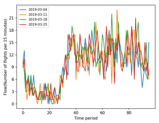 Figure 4 depicts the traffic distribution of MAMSI on every Monday over four consecutive weeks in March 2019. By examining the similarity in traffic on the same day over the four weeks, there is a high degree of resemblance in the Monday traffic trends, indicating a consistent characteristic of periodicity in the traffic distribution every Monday at this route point. By analyzing the traffic variations throughout the day, the traffic distribution at MAMSI exhibits irregular fluctuations and temporal regularities. The irregular fluctuations are characterized by non-smooth variations (not following the expected smooth curve changes) between adjacent time intervals, with unpredictable moments and amplitudes of fluctuation (due to various factors such as weather conditions, airport operational status, etc.). Temporal regularities include traffic decreasing to the daily minimum level between 03:00 and 06:00, a rapid increase from 06:00 to 08:00, maintaining a high level with fluctuations until around 22:00, followed by a continuous decrease until 03:00 the next day.